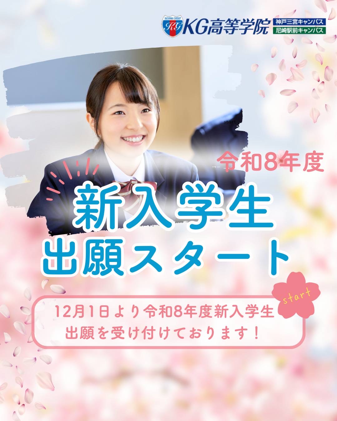 12月1日(月)より、KG高等学院神戸三宮キャンパス・尼崎駅前キャンパスでは令和8年度新入生の出願受付が始まりました。